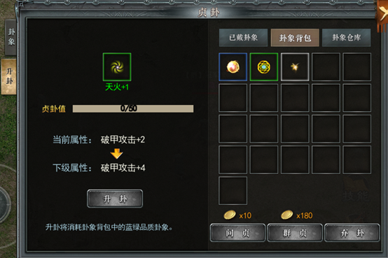 升卦:左键点击想要升级的卦象,将其放置到升卦框内,点击升卦,将会消耗卦象背包中的蓝绿品质的卦象。