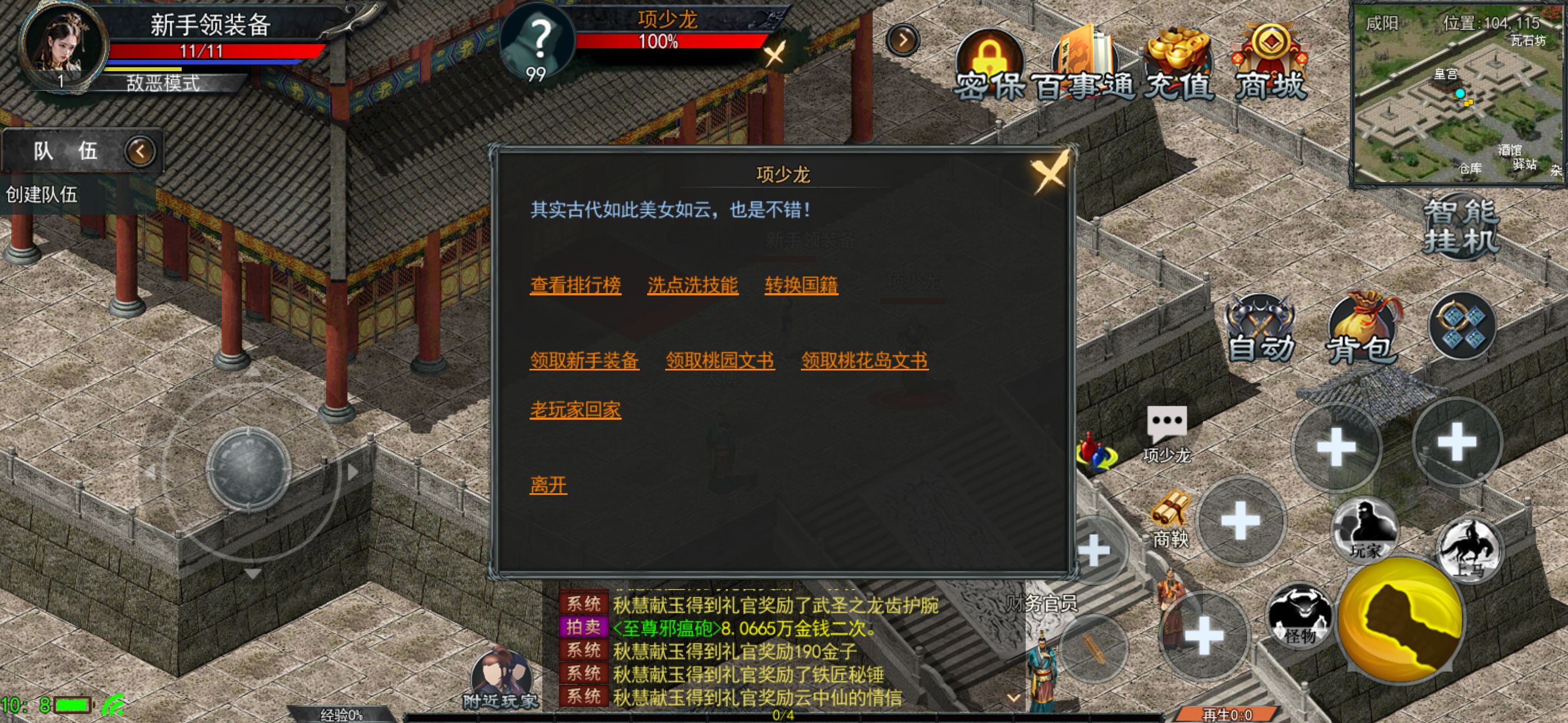 第一步:未曾领取过新手装备的玩家到本国皇宫前边与 NPC 项少龙对话,选择“领取新手装备”;
